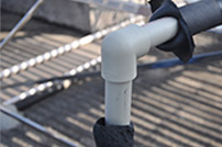 普通保溫管用橡塑棉或PEF棉包扎或扎帶困綁,一、二年后老化,保溫層萎縮破裂,斷開,內管外露,內管不抗紫外線加速老化。